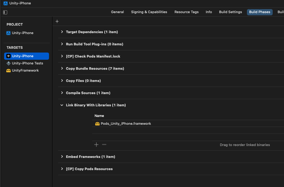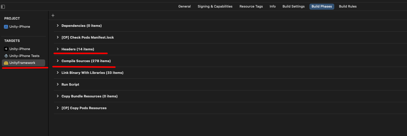 우선, UnityFramework > Build Phases로 가서 'Headers'를 드래그해서 'Compile Sources' 보다 위쪽으로 옮겨주세요.