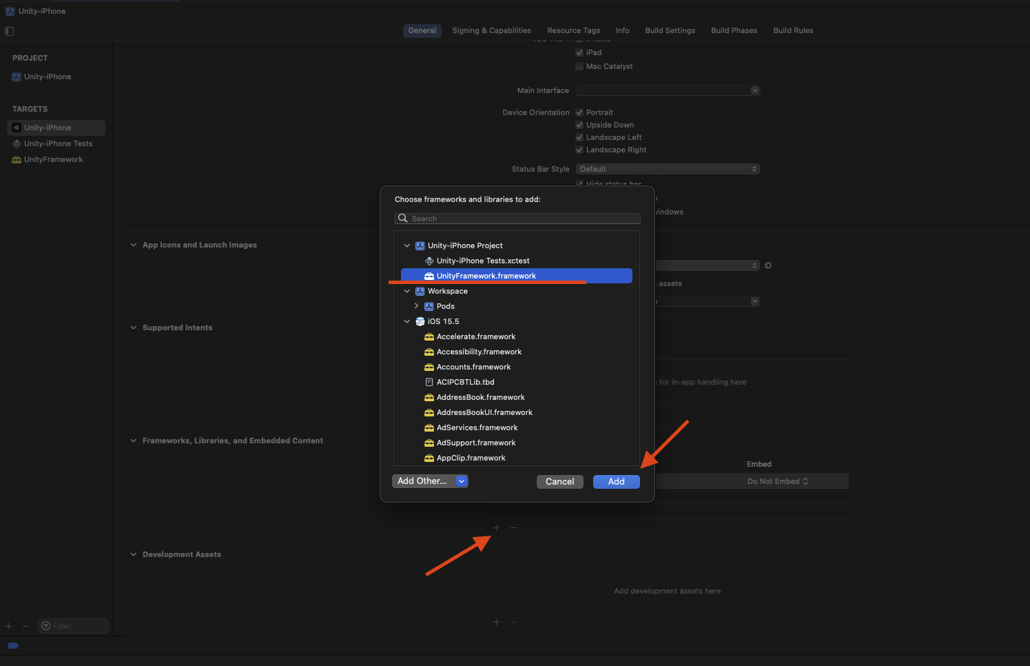'+' 버튼을 눌러 다시 UnityFramework.framework를 추가해주세요.