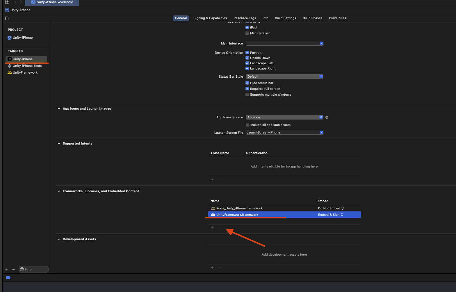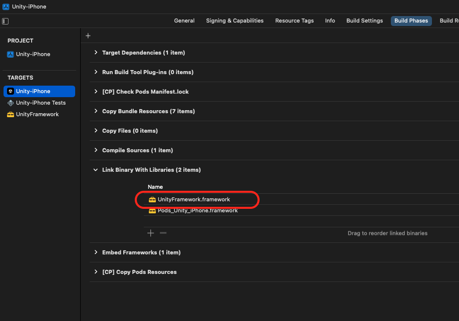 Unity-iPhone > General > Frameworks, Libraries, and Embedded Content로 가서 UnityFramework.framework를 선택한 후 '-' 버튼을 클릭해 의존성을 제거해주세요.