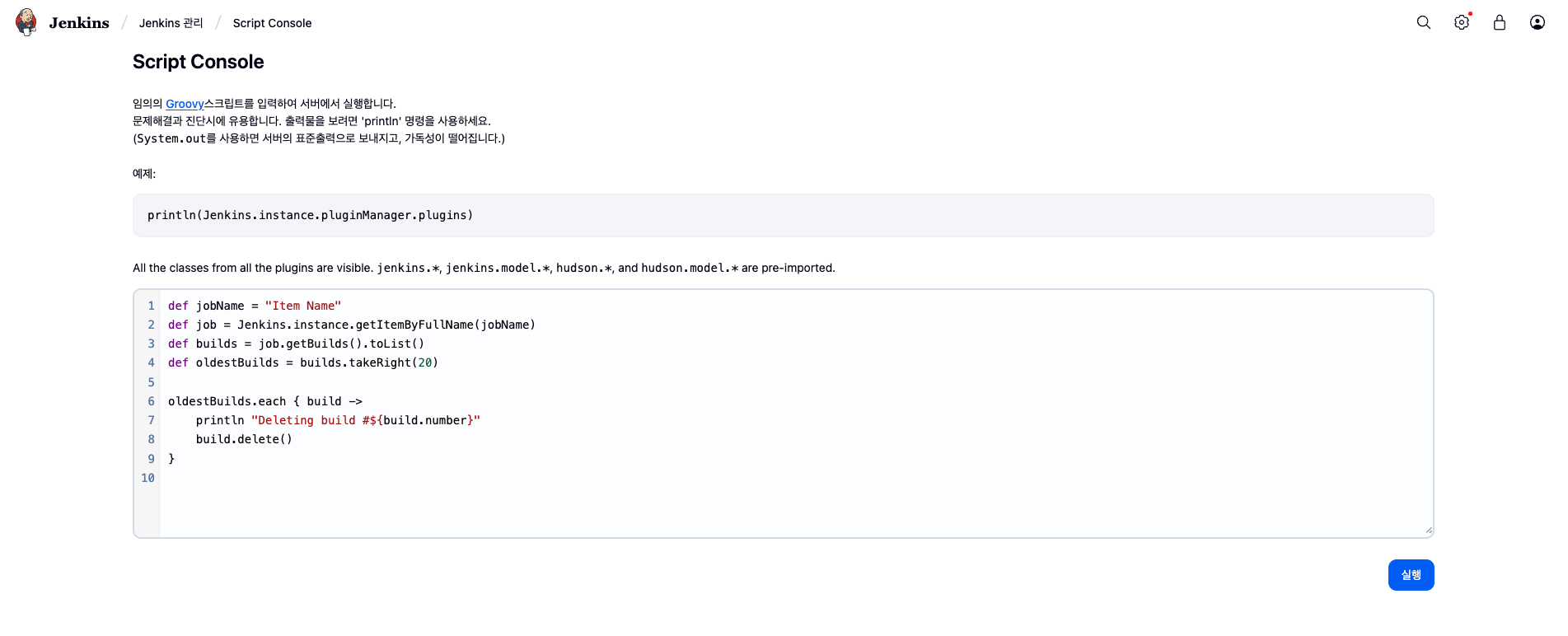 'Jenkins 관리 > Script Console'으로 접속한 후에 아래 스크립트를 실행해 주세요.